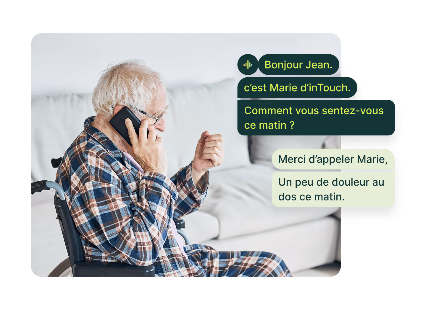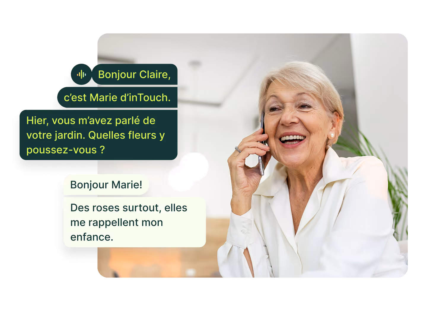 inTouch propose des appels téléphoniques réguliers et personnalisés, conçus pour soutenir la santé émotionnelle et cognitive des personnes âgées. Ces conversations aident les résidents à rester mentalement actifs, à se sentir plus connectés et à préserver les histoires et les routines qui façonnent leur identité.